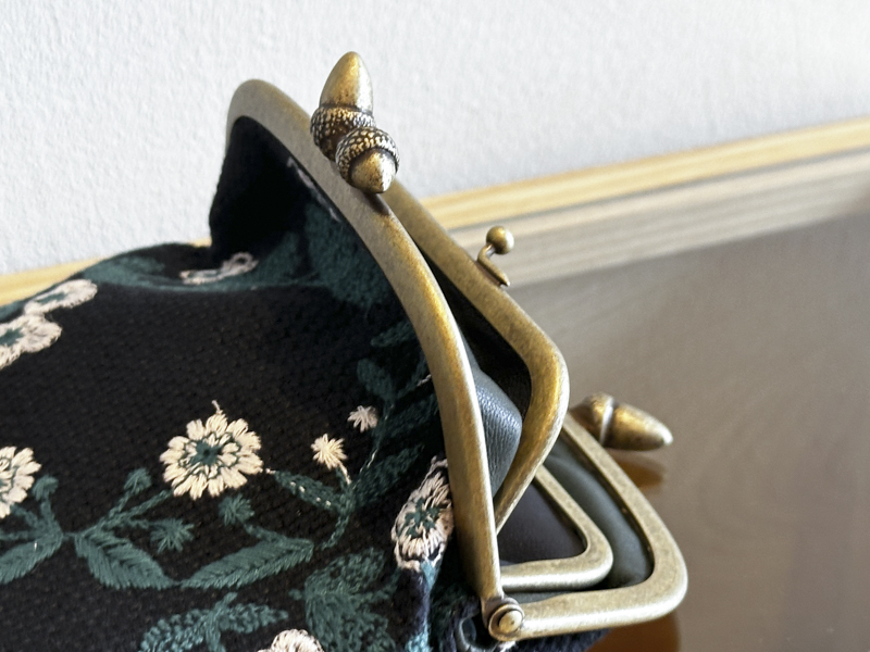 がま口の先に可愛いどんぐり3つ、中にはもう一つがまぐちがあって仕分けしてつかいやすいように作られています。